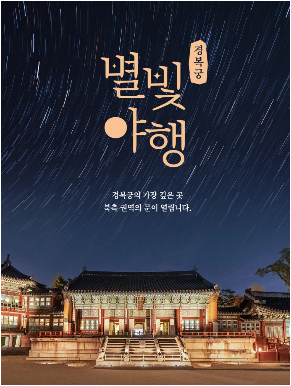별 가득한, 경복궁 별빛야행에 여러분을 초대합니다. 은은한 별빛 아래 경복궁 소주방에서 국악공연을 즐기며 수라상을 맛보고 전문해설사와 함께 경복궁 별빛 산책을 떠나보세요
